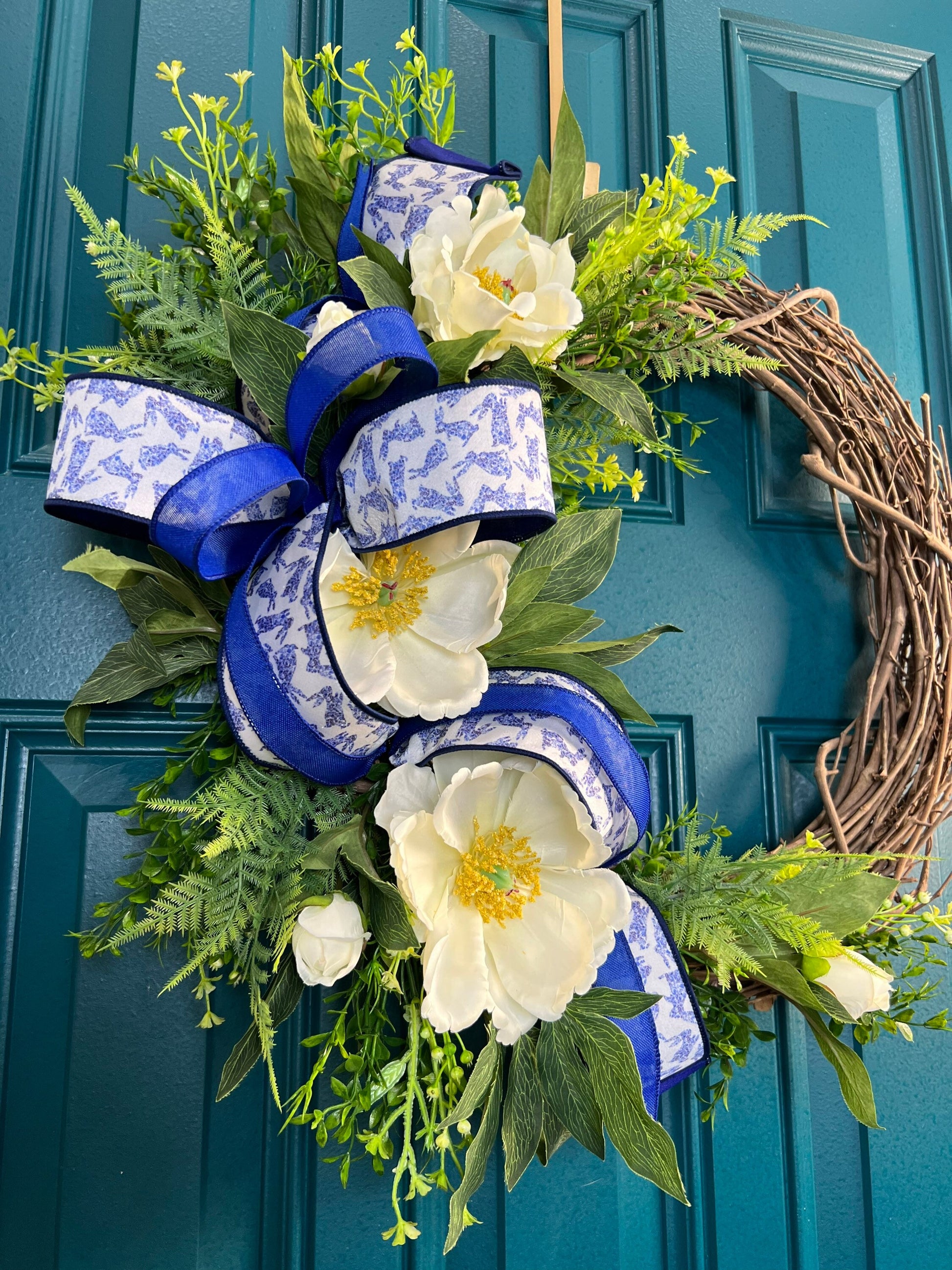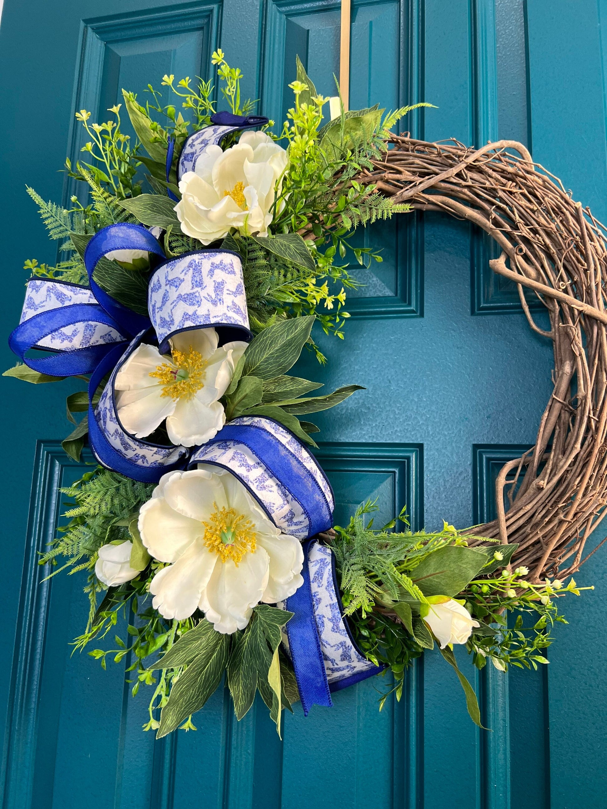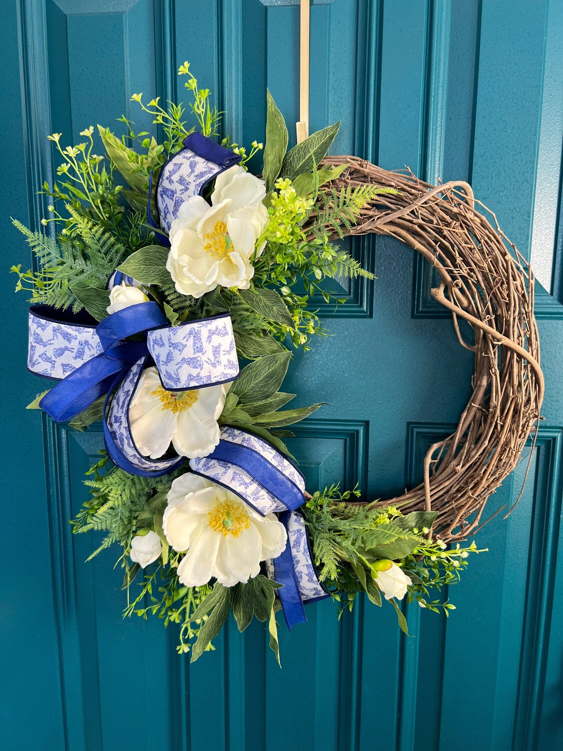 This beautiful wreath is the perfect addition to your home decor for the spring season. The wreath is made with a sturdy grapevine base of lush greenery and magnolias adorned with beautiful white magnolias.